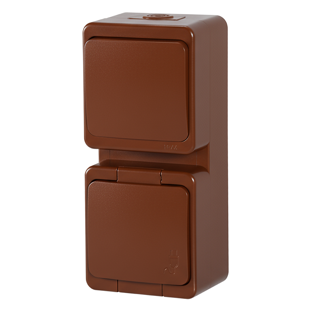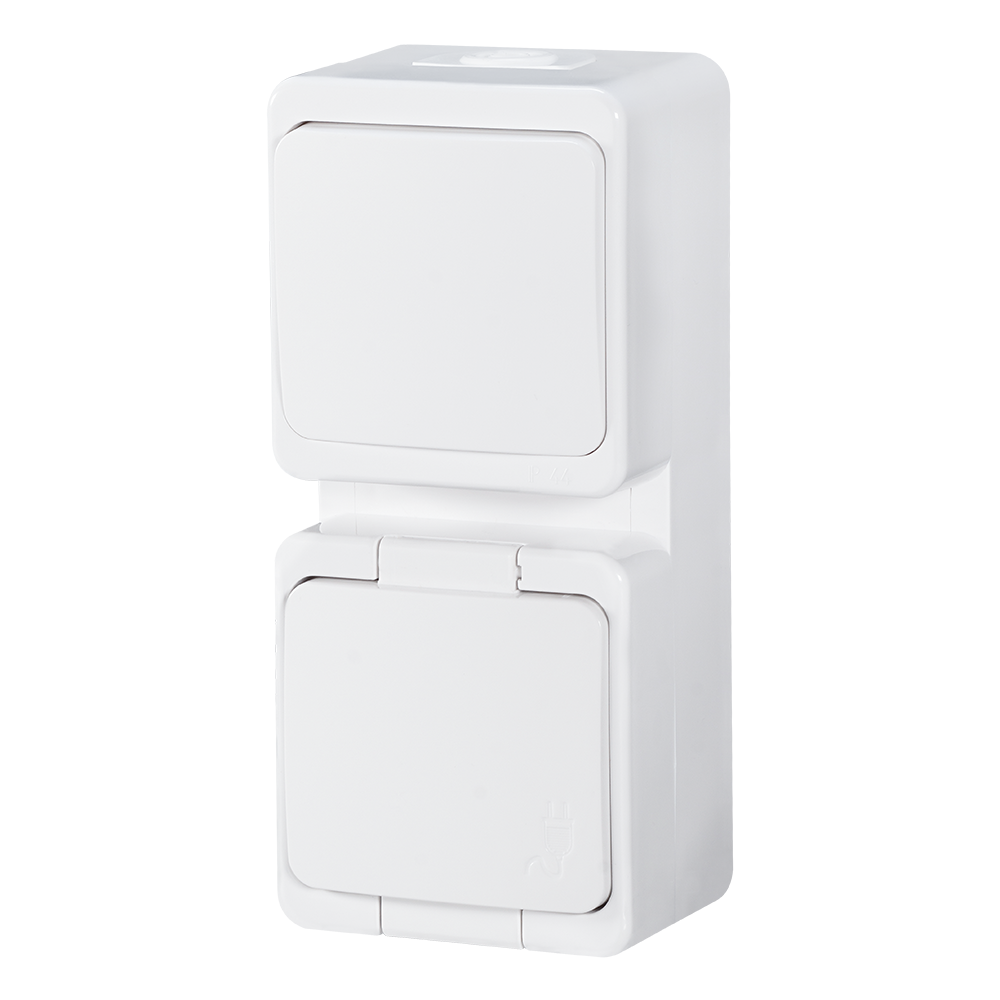 Gniazdo pojedyncze 2P+Z bryzgoodporne z klapką w kolorze wyrobu + łącznik 1-biegunowy IP44 pionowy