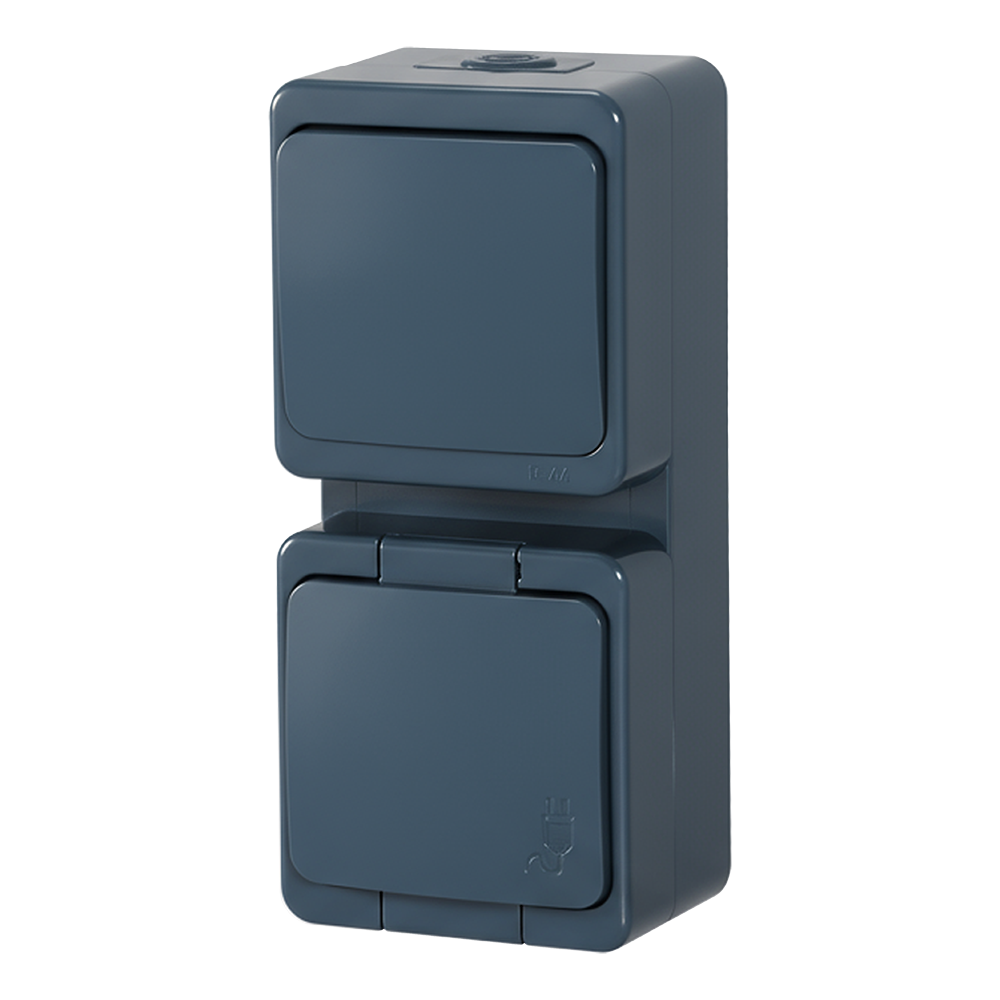 Zestaw pionowy: łącznik n/t.10A, 250V, 1-biegunowy IP44 + gniazdo pojedyncze 2P+Z bryzgoodporne z klapką w kolorze wyrobu. Występuje w wersji schuko